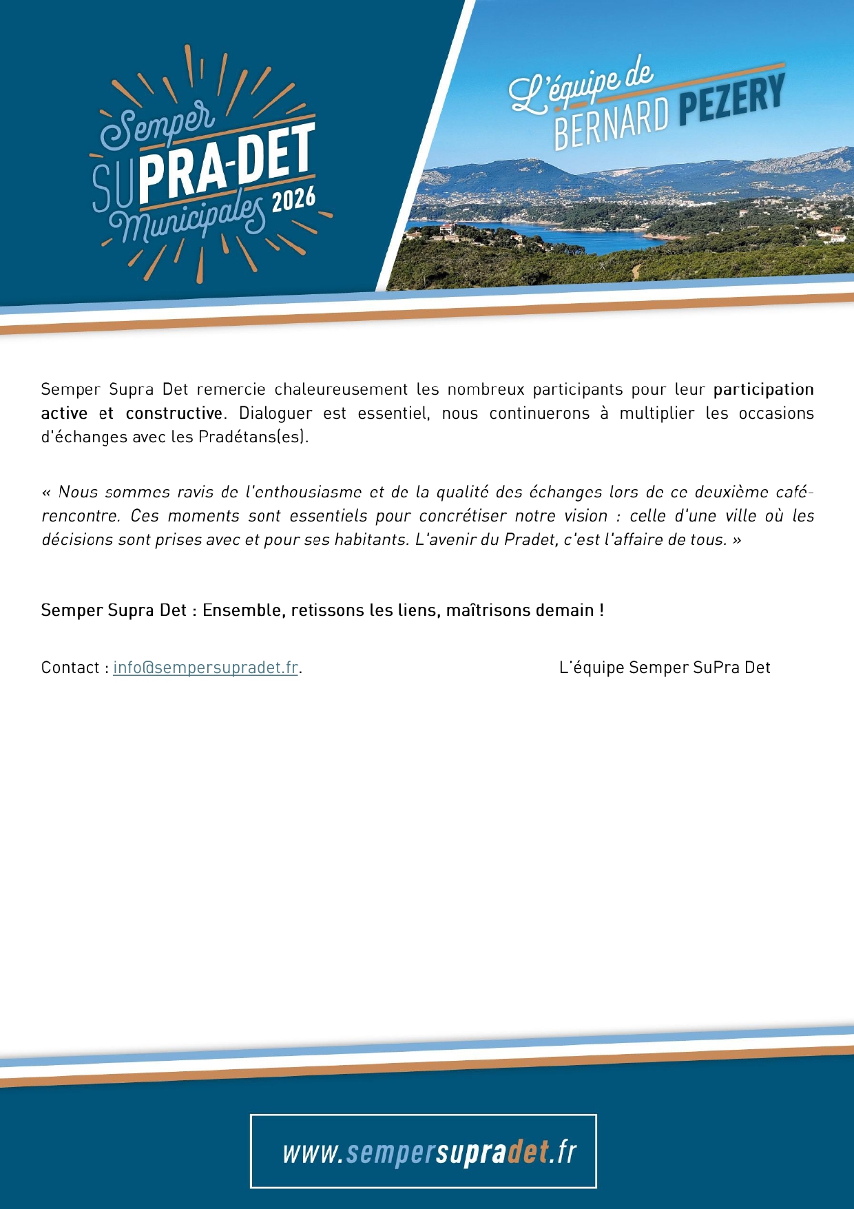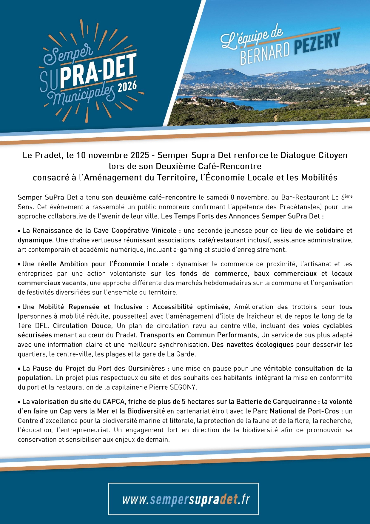 Café-rencontre n°2 – L’économie locale, Les mobilités et l’Aménagement du territoire – Notre communiqué de presse Café-Rencontre n°2 Semper Supra Det : Un succès qui confirme l’urgence d’agir ENSEMBLE pour Le Pradet ! 🚀 ➡️ Retrouvez ici notre communiqué de presse 📰 ! Éric JOFFRE2025-12-27T08:15:56+00:0016.11.2025|Uncategorized| Related Posts Café-rencontre n°4 : Bien grandir, bien vieillir, tisser des liens entre hier et demain. Café-rencontre n°3 : Services au quotidien, Prévention et Sécurité – Notre communiqué de presse 1er Café-Rencontre Semper Supra Det Lancement de campagne